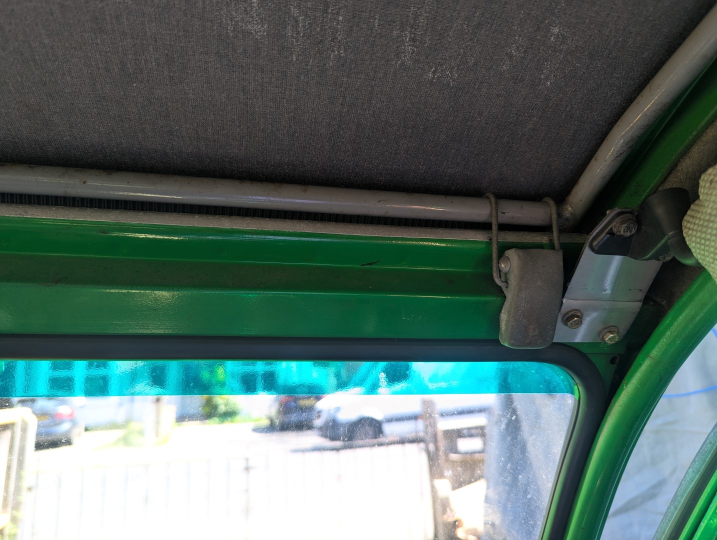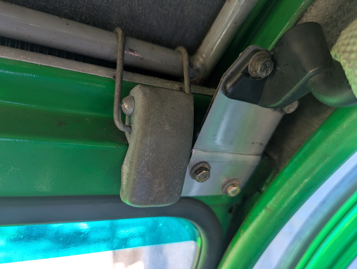 - Remove the 2 screws* that secure you sun-visor and roof hook mechanism (*8mm hex on later cars).